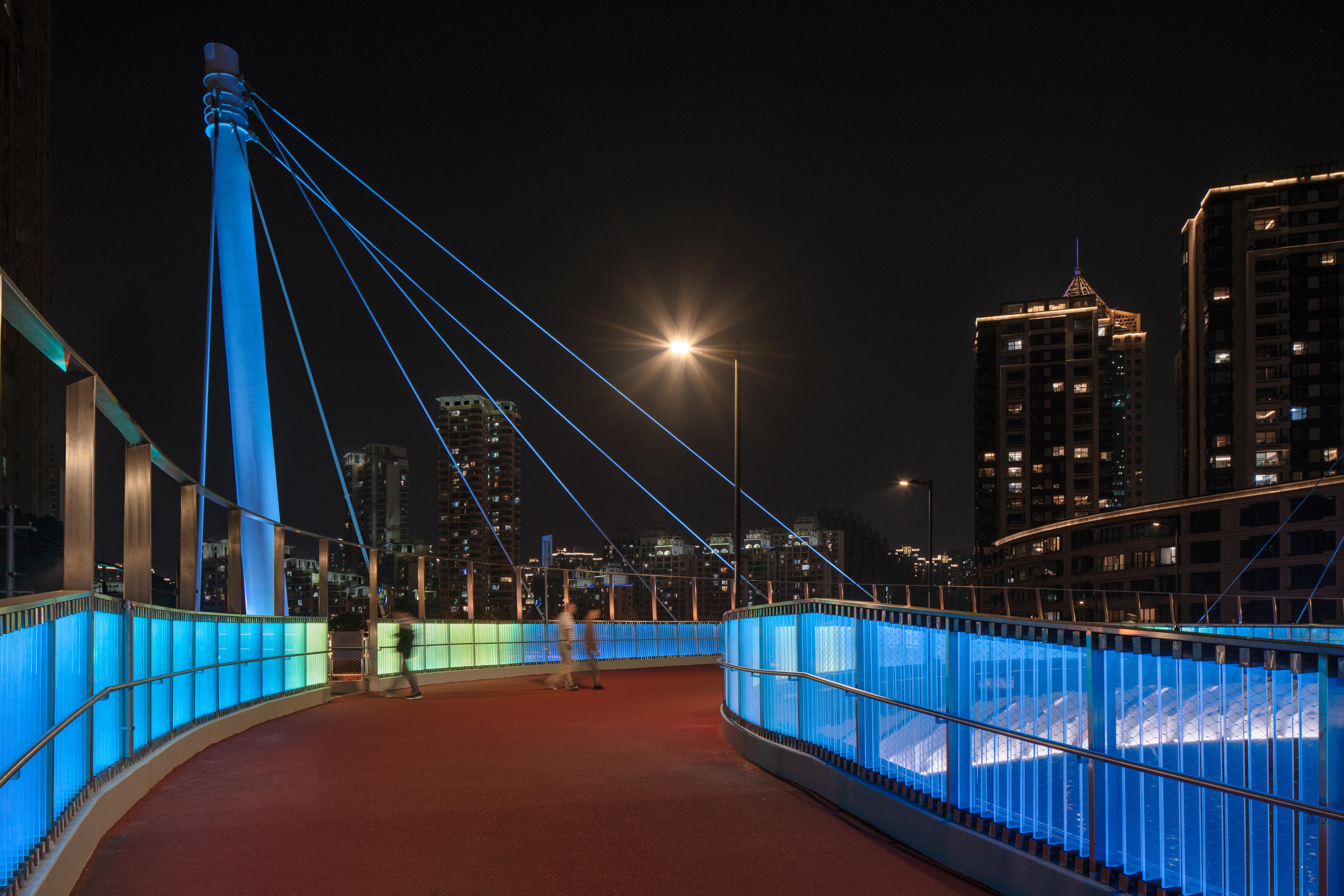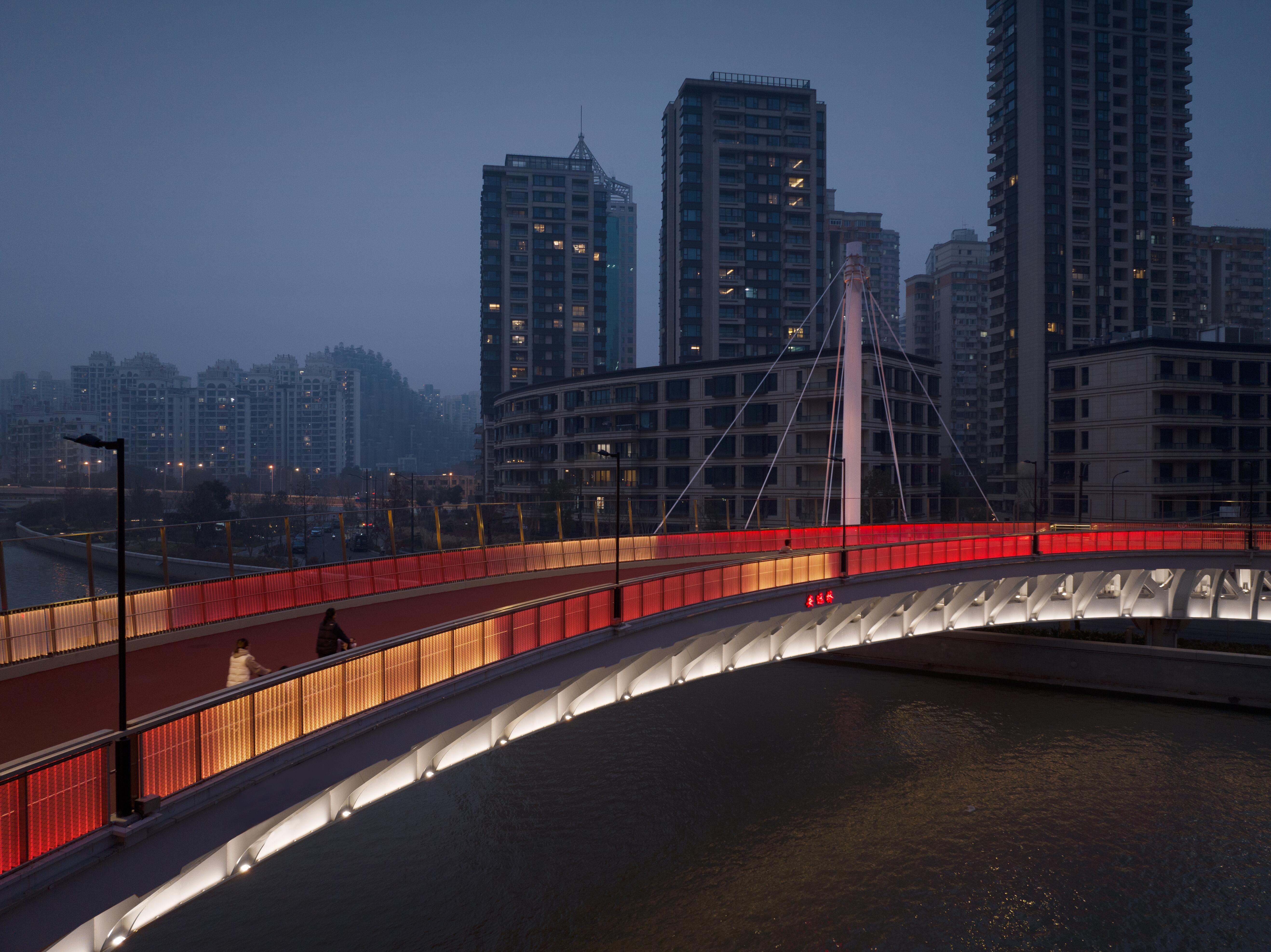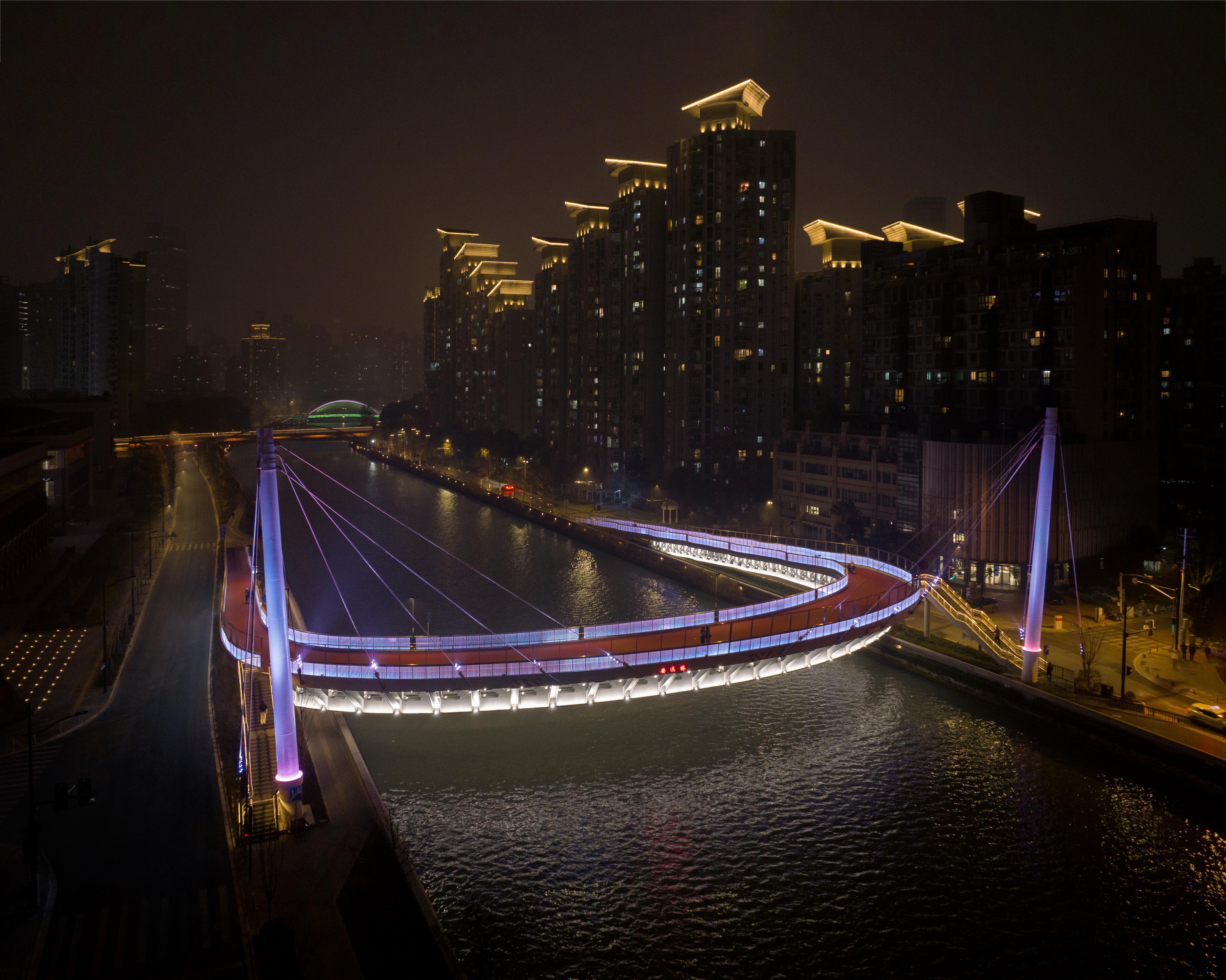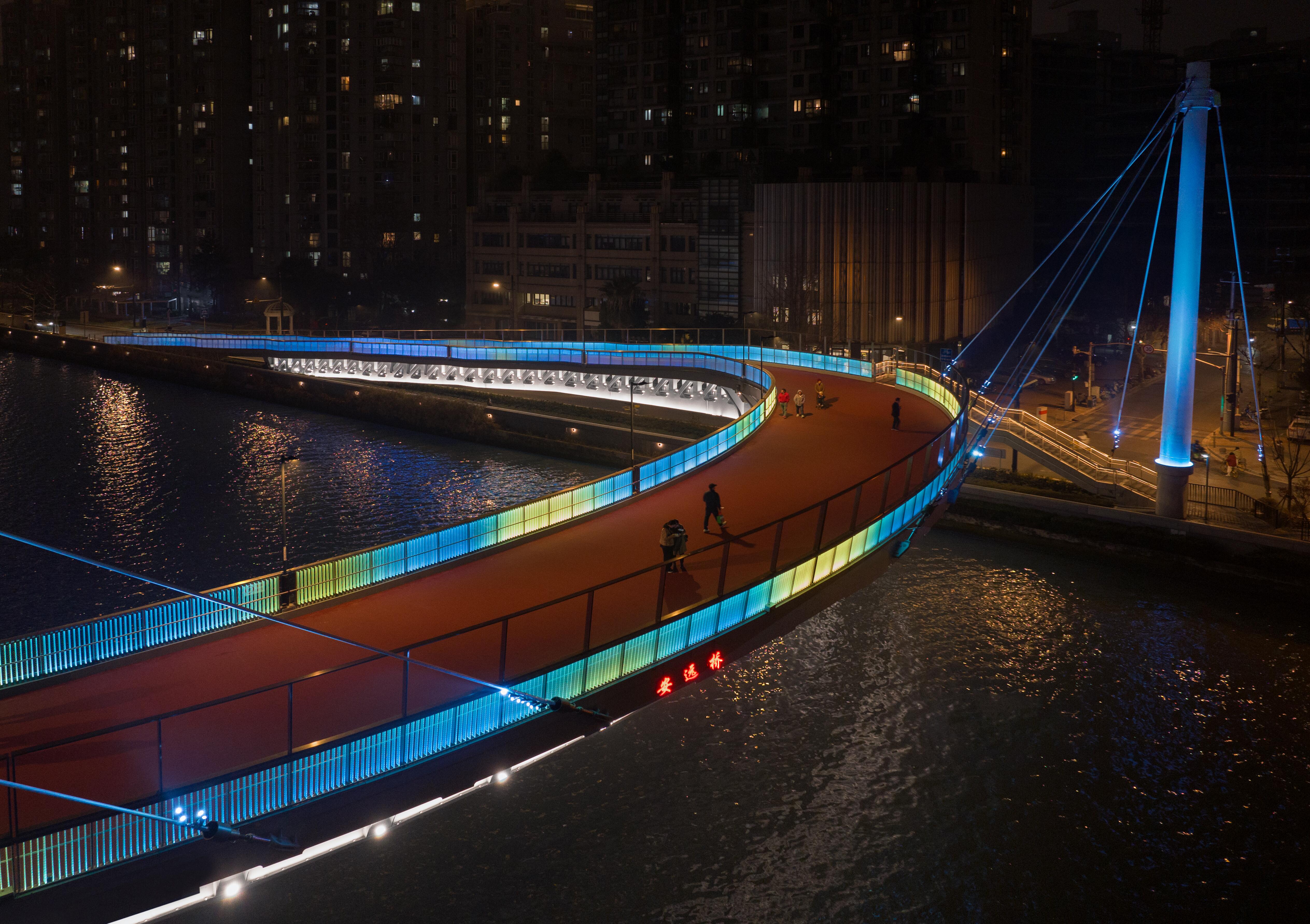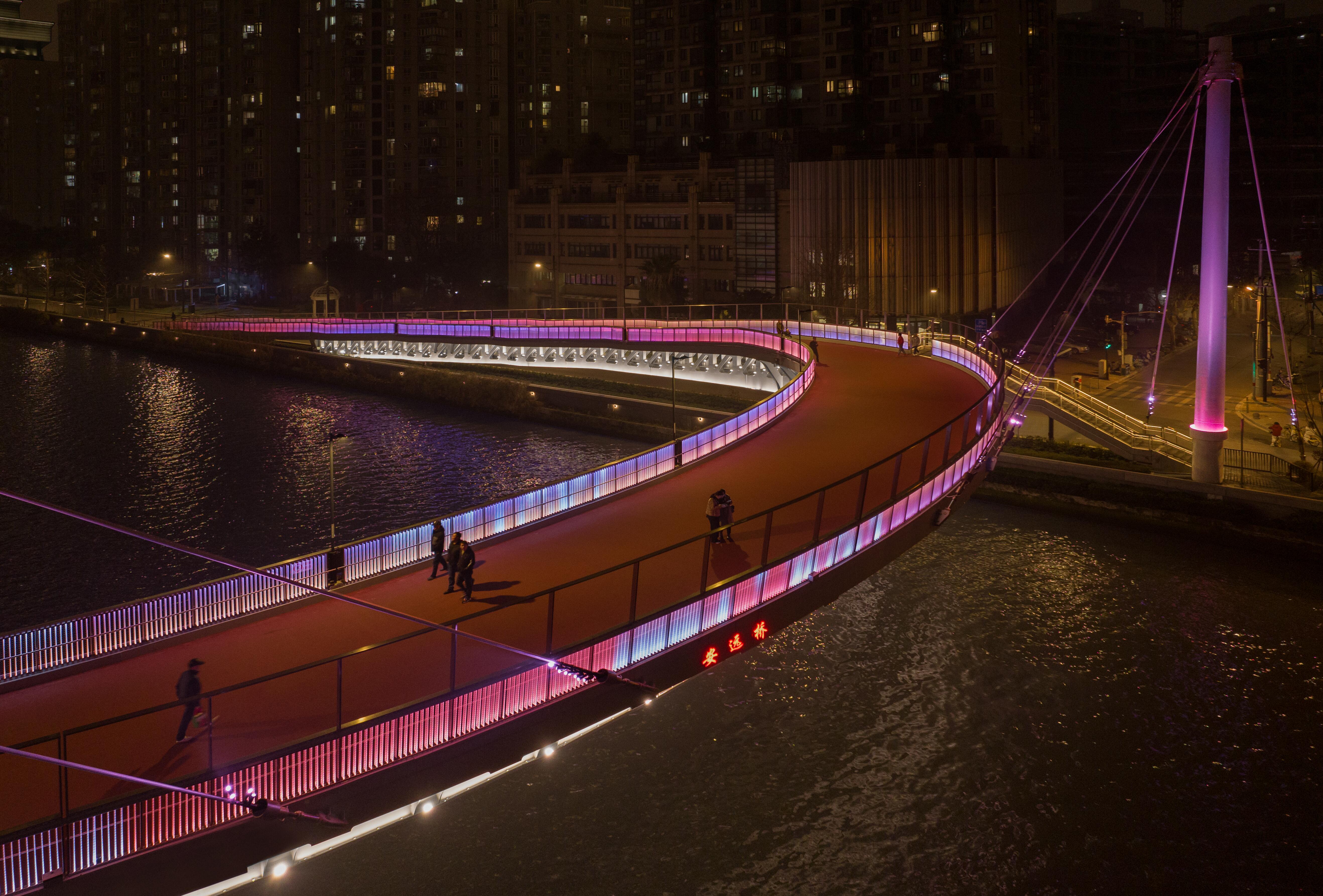 该项目位于世界级滨水商务区中心地带——苏州河静安段安远路与西苏州路交叉口,连接苏州河西侧、静安国际中心和不夜城商圈,是夜间活力以及城市步行网络的重要节点。作为上海“一江一河”的重要项目,安远桥以其独特的U形结构漂浮于苏州河上空,以3跨钢桁架连续梁结构和辅助双塔拉索实现一跨过河,使其在苏州河畔独具特色。通过此次灯光的提升,安远桥化身为城市的“趣桥”,如一条流光韵彩的项链点缀于城市夜色,尽显静安苏州河优雅品质。