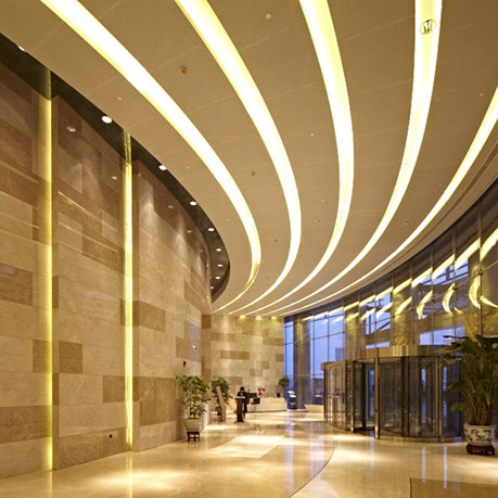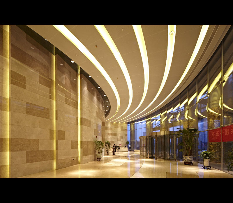建筑师希望灯具的安装位置是隐藏的,灯光尽可能看不到发光点,光和建筑要自然协调统一。结合外形和结构的要求,找到了一个有效的解决方法,就是在每段平台上设置灯具。每一段幕墙立面上都有一个转折角度,上部分的幕墙是较为倾斜的,下部分的幕墙在中间段转折,相对比较垂直,通过合理的配光选型实现非常均匀的布光效果。