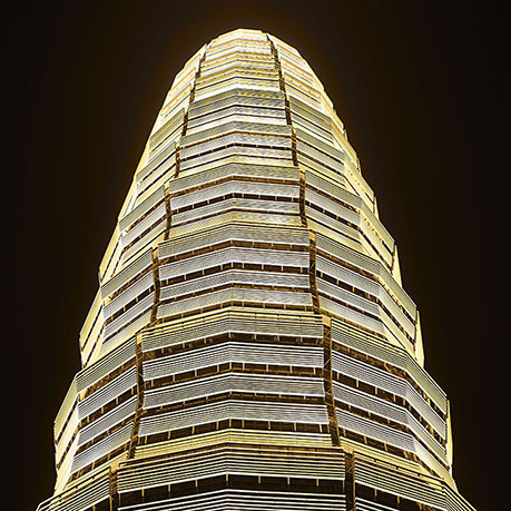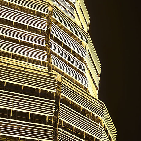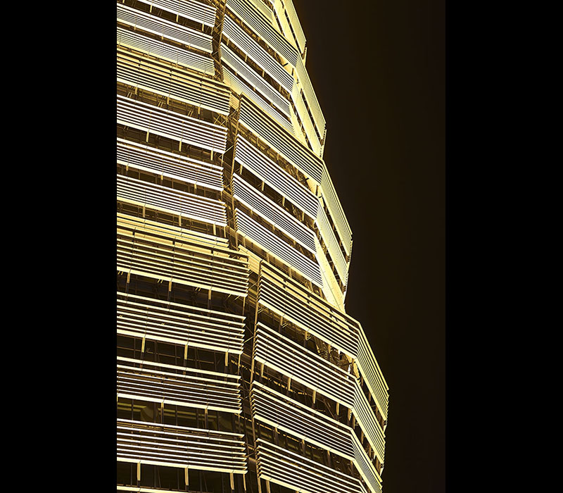 建筑师希望塔楼的外形美观独特,但如何保持每层外观照明效果一致是个设计难题。由于幕墙上部分和下部分的照明方式是不同的,所以对应的投光灯具也是不同的。幕墙下部采用较宽的光束角,幕墙上部采用较窄的光束角。
