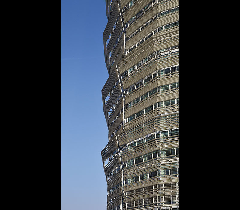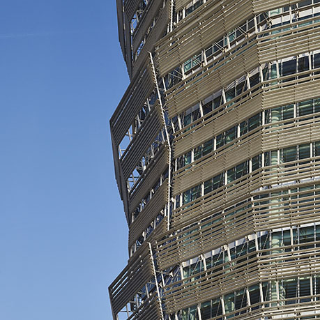 外倾式铝制遮阳板将大厦环绕;倾斜的遮阳板通过科学计算的光线反射,提升了室内自然采光的效果,减少了对人工照明的需求。